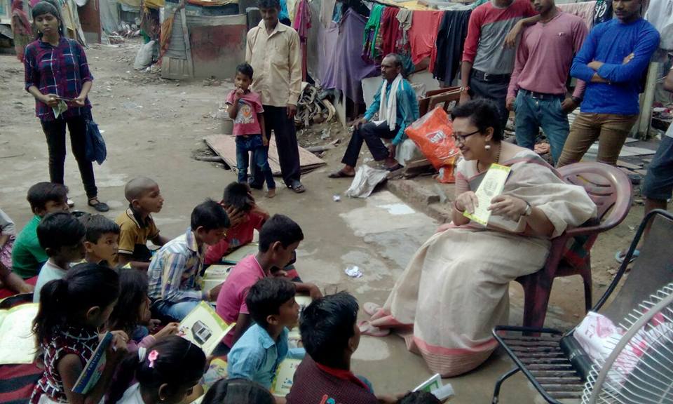 Got the opportunity to talk to little children at Gole market. It was a great feeling to know that these children had the concept of Independence ,knew our freedom fighters and their struggle for Independence and also the meaning of Ahimsa. Children were able to understand the stories of Ishwar Chandra Vidyasagar , Lal Bahadur Shastri , Swami Vivekanand , and Gandhiji narrated by me . These children were very bright and had the urge to read and do well in studies. Tak Dhina Dhin , my poetry books were also distributed. Children loved singing the songs of the books. It was a lovely evening spent with these kids. Thanks to Sarvahitey, an Ngo whose young brigade is doing so much for these under privileged kids and made this visit a memorable one.